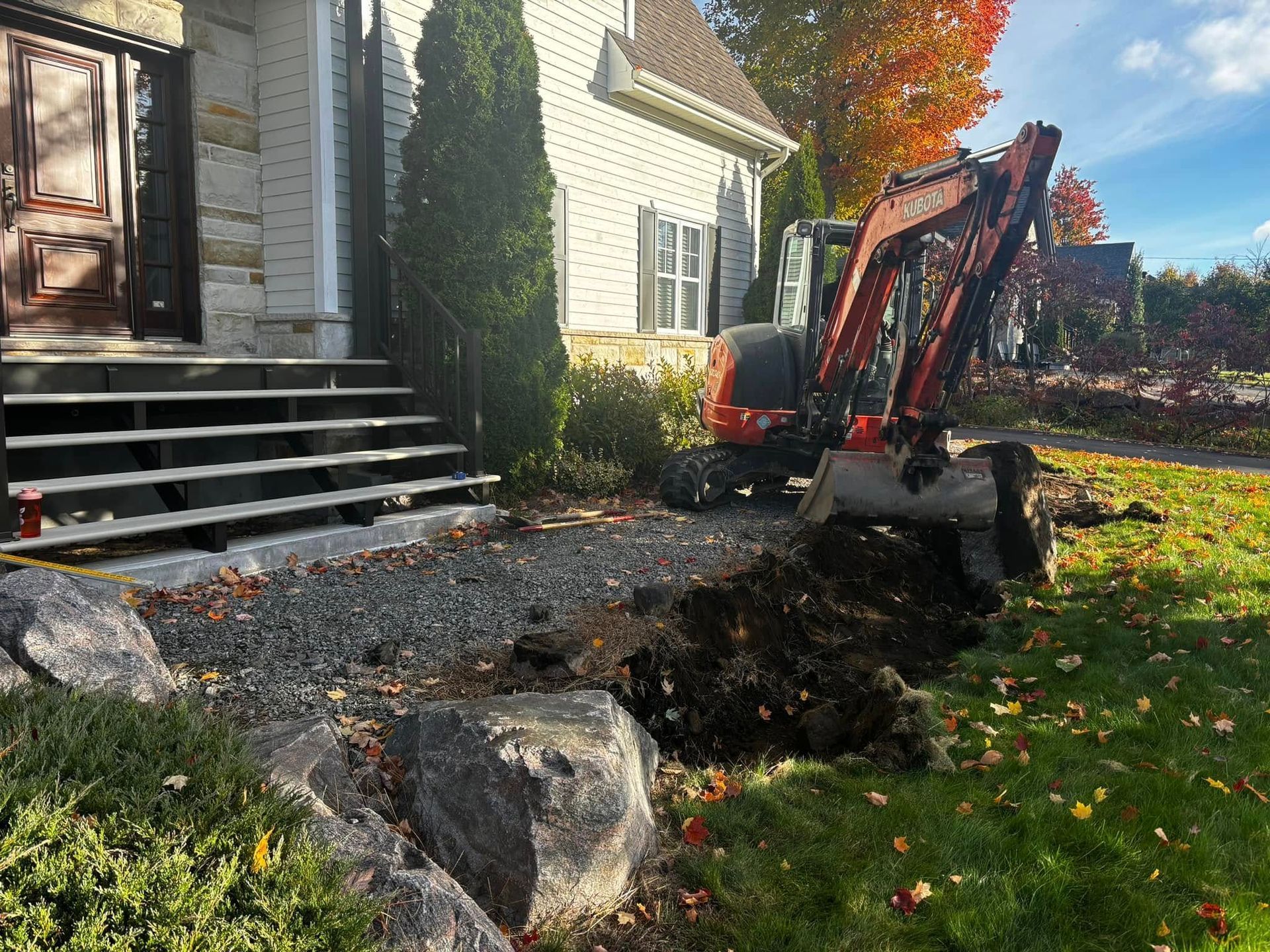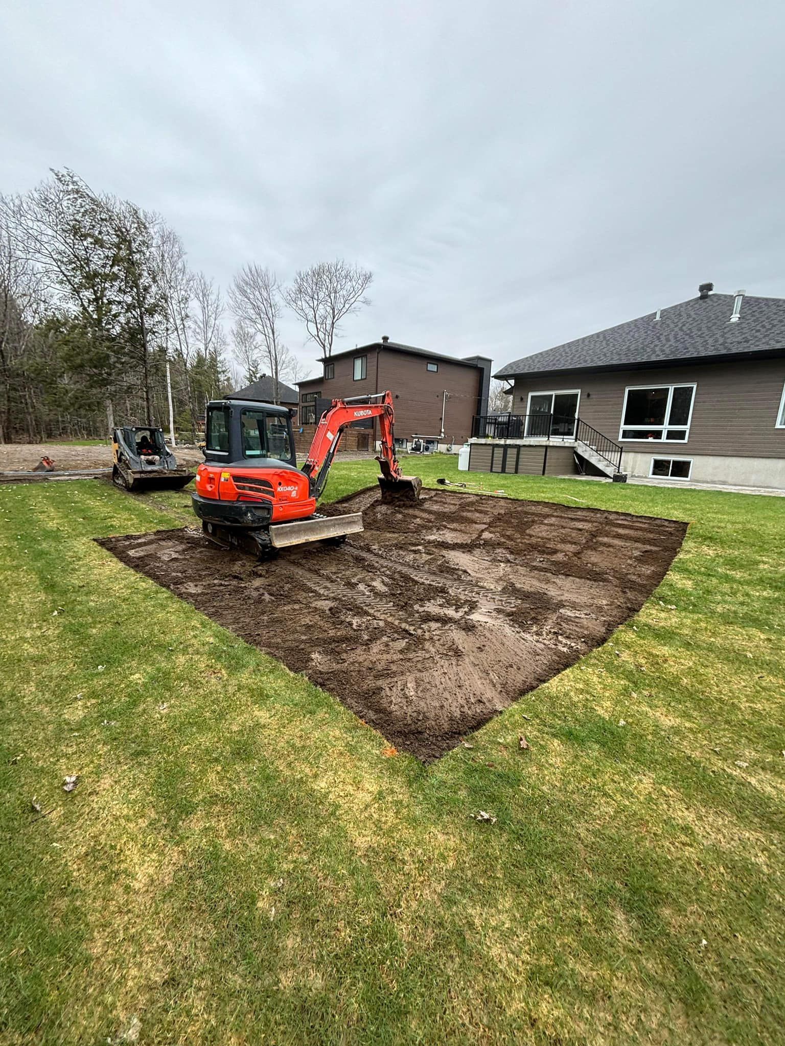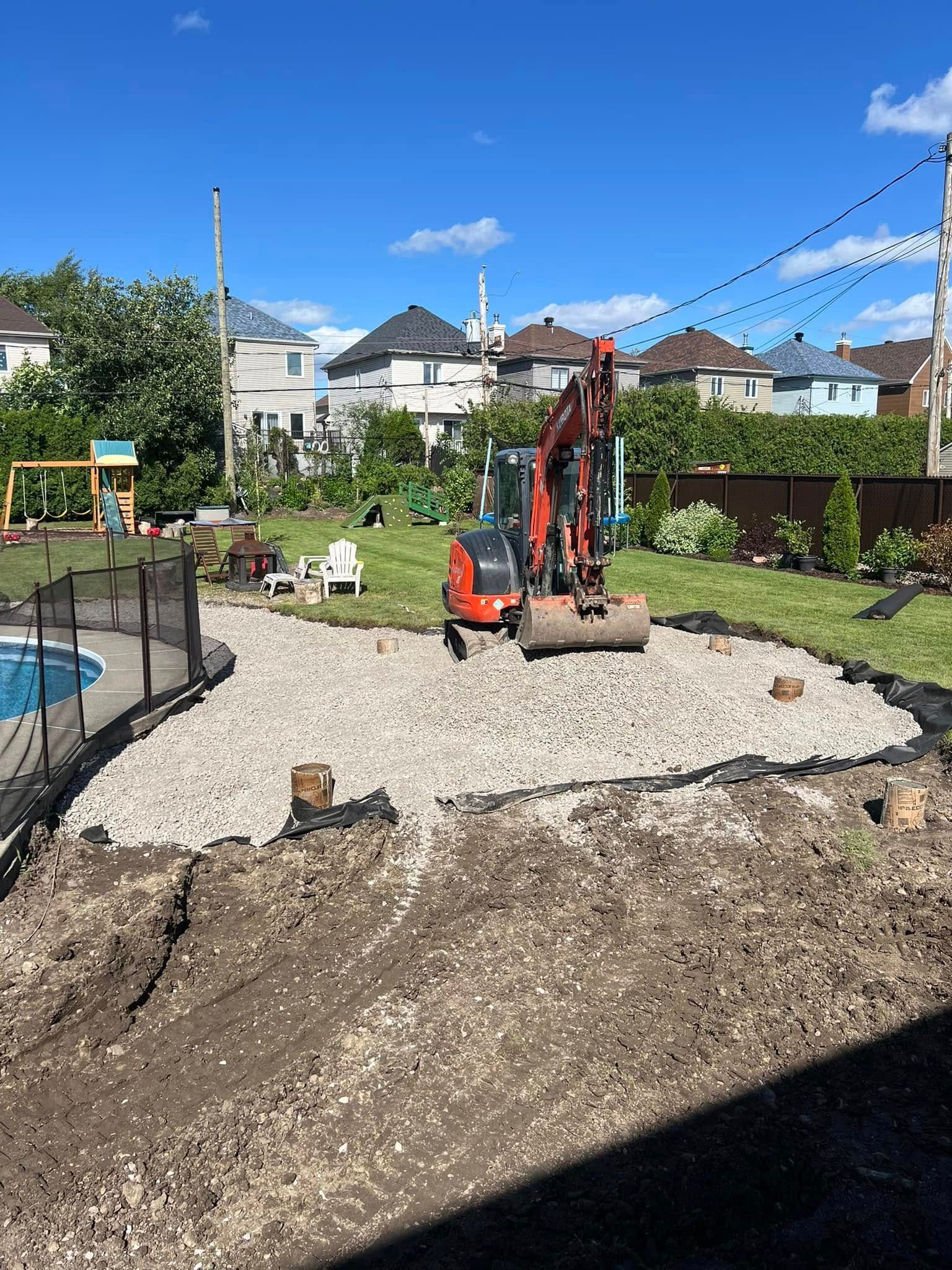 On organise stratégiquement le chantier pour minimiser l'impact sur vos pelouses et entrées existantes. Notre camion 12 roues et semi-dompeur évacuent rapidement les surplus de terre.